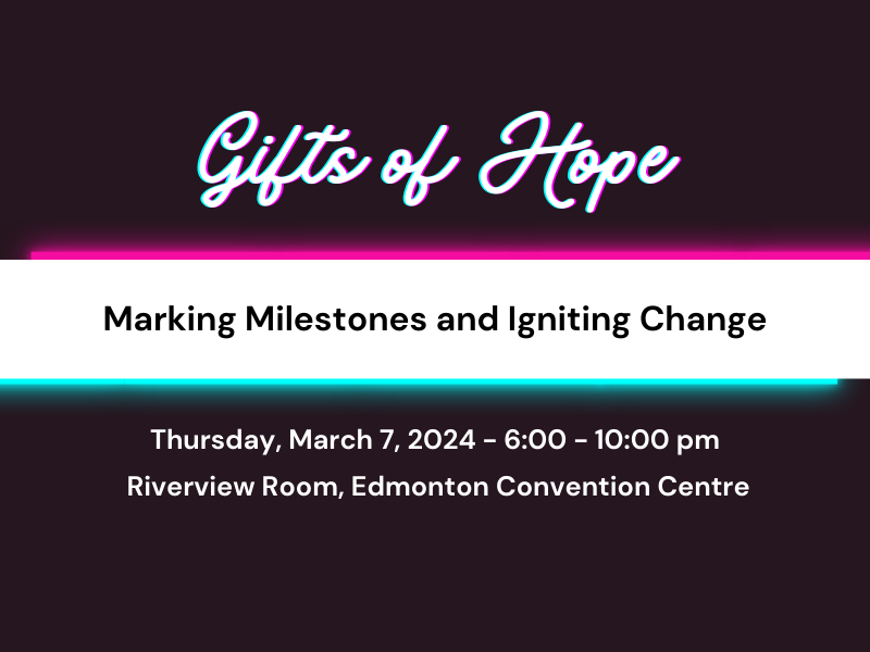 March 7, 2024 - 6:00 pm - 10:00 pm MST Gifts of Hope 2024: Marking Milestones and Igniting Change Edmonton Convention Centre 9797 Jasper Ave, Edmonton In 1983 ACWS began with a box of files and...