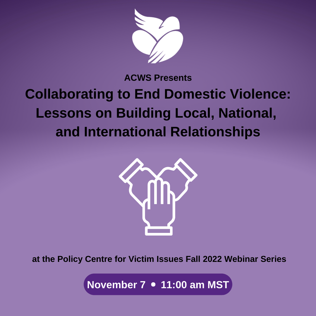 November 7, 2022 - 11:00 am - 1:00 pm MST ACWS Presents at the Policy Centre for Victim Issues Fall 2022 Webinar Series Collaborating to End Domestic Violence: Lessons on Building Local, National,...